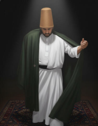 The act of taking off the cloak signifies the dervish’s release from worldly attachments and the beginning of a spiritual transformation. This gesture shows the transition from the material realm to the start of the spiritual journey.